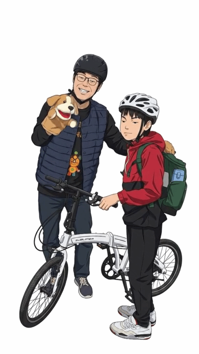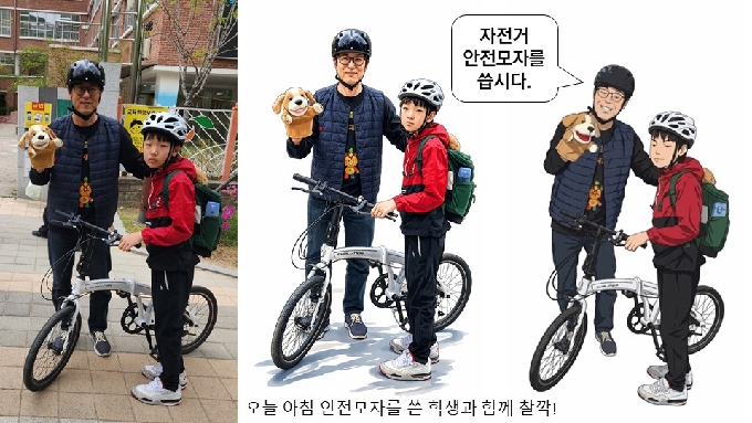 아침 등굣길입니다. 자전거를 타고 오는 아이와 눈이 마주쳤습니다. 안전모자를 쓴 친구와 사진을 한 장 찍었어요.