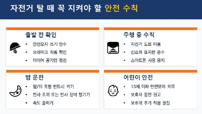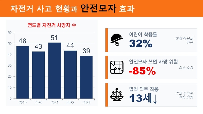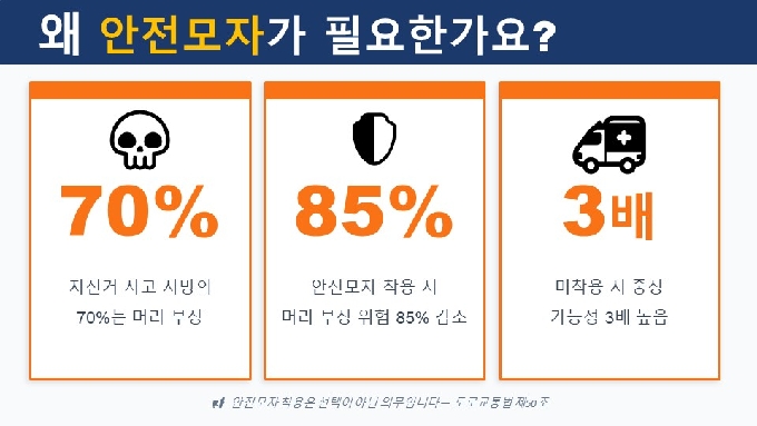 👉 “왜 우리는 안전모를 꼭 써야 할까요?” 자전거를 탈 때 가장 먼저 지켜야 할 약속입니다. 바로 머리를 지키는 일입니다. 자전거 사고가 나면 몸보다 먼저 부딪히는 곳이 어디일까요? 바로 ‘머리’입니다. 실제로 자전거 사고 사망자의 약 70%가 머리 부상 때문이고, 안전모를 쓰면 머리 부상 위험이 크게 줄어든다고 합니다. 넘어지는 순간은 미리 알려주지 않습니다. (출처: 도로교통공단, 행정안전부 교통안전 자료 / 기준: 2024년)
