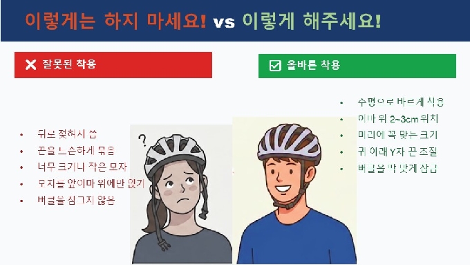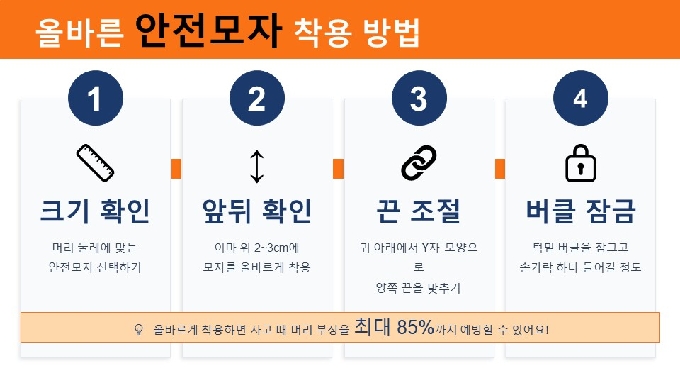안전모는 제대로 써야 효과가 있습니다. ✔ 머리에 꼭 맞게, ✔ 이마 위 2~3cm 위치, ✔ 끈은 귀 아래에서 Y자 모양, ✔ 버클은 턱 아래 단단히 제대로 쓰는 것이 안전입니다.