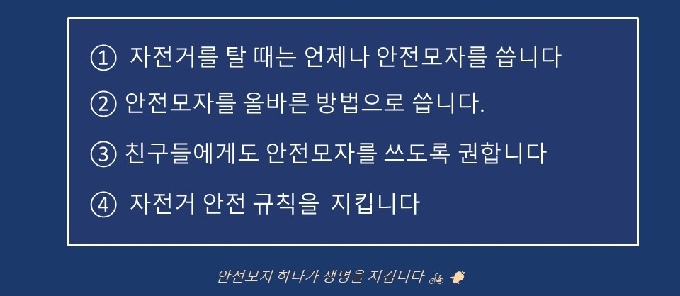 다음 주부터 안전모를 쓰고 온 아이들이 더 늘어났으면 합니다. 습관은 하루아침에 만들어지지 않지만 하루하루 쌓입니다. “안전모 하나가 내 생명을 지켜요.” “친구에게도 꼭 말해 주세요.” 우리 모두 이렇게 약속해 볼까요?