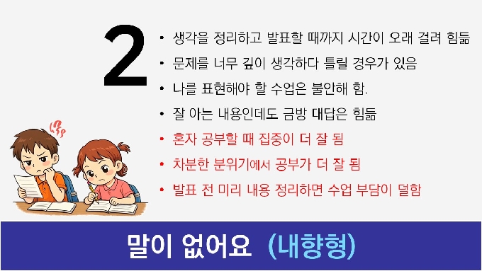 이런 아이를 두고 “왜 발표를 안 하니?”라고만 다그치면 더 움츠러들 수 있습니다. 오히려 미리 생각을 정리할 시간을 주고, 안전하게 말할 수 있는 분위기를 만들어주는 것이 중요하다고 했습니다.