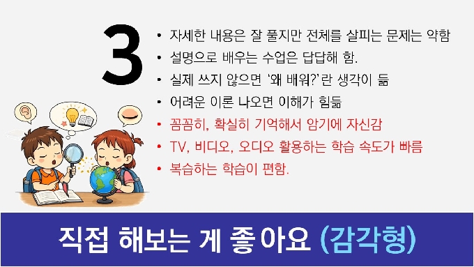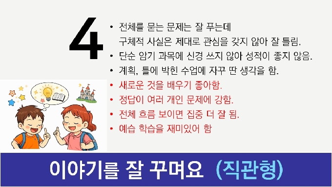 이 유형은 설명만 길게 듣는 수업이 답답하고, “왜 이걸 배워요?”를 자주 묻습니다. 세부적인 감각, 실제 경험, 이미지, 구체 상황과 연결될 때 이해가 더 잘되는 아이입니다.