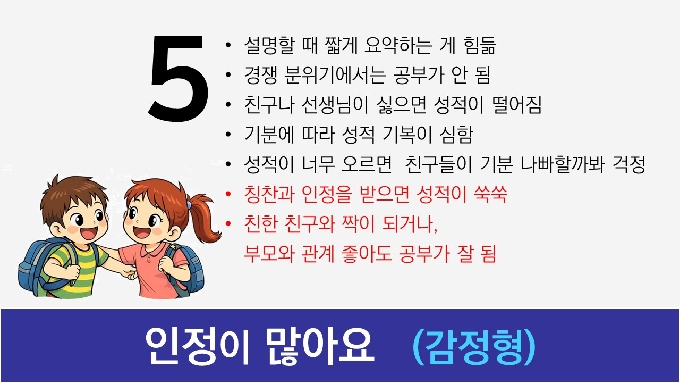 기분, 관계, 인정, 칭찬에 민감한 아이입니다. 친구와 관계, 교사와 관계, 분위기에 따라 학습하는 힘이 크게 달라질 수 있습니다.