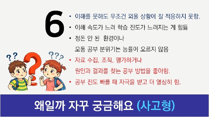 이야기를 자주 하고, 주변에 관심이 많고, 조용히 앉아서 오래 공부하기는 힘들지만 발표, 연극, 토론, 상호작용이 있는 수업에서 더 편안한 아이입니다.