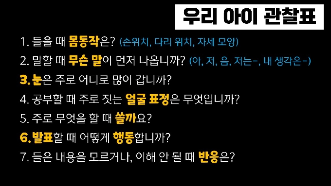 아이를 세심하게 관찰하고, 익숙한 틀로 재단하지 말고 새롭게 발견하고, 그 발견 위에서 더 깊이 사랑합시다. 집에서 “그때 표정이 왜 그랬어?”. “다리를 꼬고 있던데, 불편했어?” “그 순간 어떤 생각을 했어?” 라고 물으며 수업 장면에서 아이 마음을 읽어보세요. 아이 표정 하나, 행동 하나 가장 오래, 가장 깊게 볼 수 있는 사람은 부모입니다.