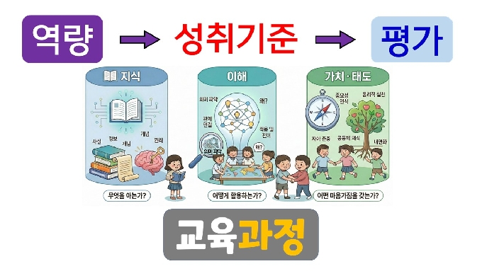학교는 지식, 이해, 가치와 태도를 함께 기릅니다 예전에는 학습 목표를 중심으로 “무엇을 알게 되었는가”에 초점이 있었다면, 지금은 성취기준과 역량 중심 교육과정으로 바뀌었습니다.