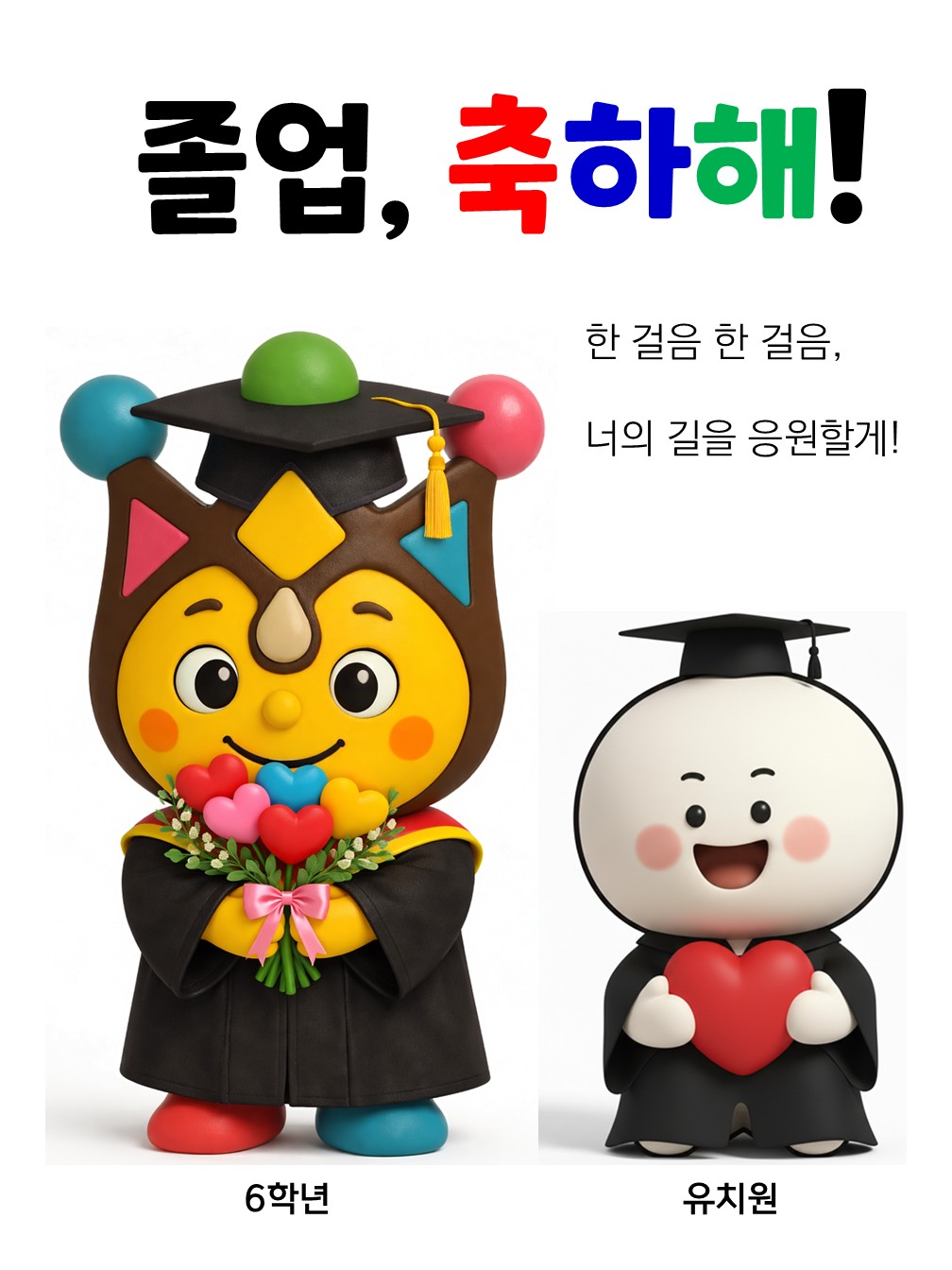 🌱 졸업은 끝이 아니라, ‘자라난 증거’입니다. 유치원 아이는 작은 손으로 하트에 꼭 안고 있었지요. 6학년은 꽃다발을 안고 있었고요. 그 꽃 속에는 6년 동안 웃음, 실수, 도전, 눈물이 함께 들어 있었답니다. 졸업은 “잘 가!”가 아니라 “참 잘 자랐다!”라고 말해 주는 날이에요.