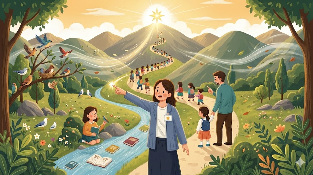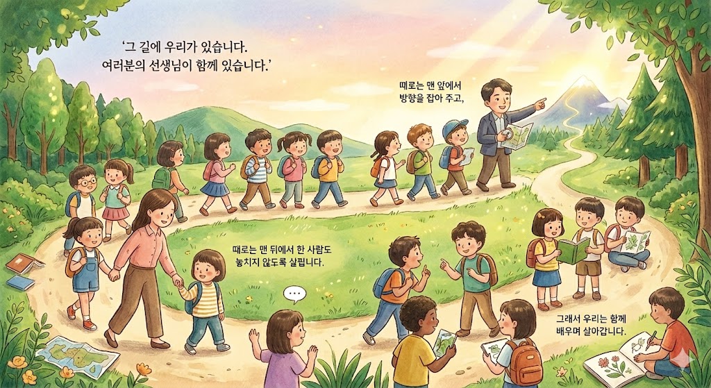 그 길에 우리가 있습니다. 여러분의 선생님이 함께 있습니다. 때로는 맨 앞에서 방향을 잡아 주고, 때로는 맨 뒤에서 한 사람도 놓치지 않도록 살핍니다.