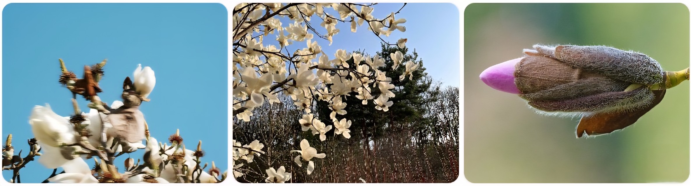 목련은 꽃이 하늘로 입을 벌리고 핍니다. 마치 나무 위에 하얀 새들이 앉아 있는 것 같습니다. 꽃이 커서 멀리서도 잘 보입니다. 꽃잎이 아주 두툼해서 만져보고 싶겠지만, 상처가 나면 금방 갈색으로 변합니다. 눈으로만 보고 아껴줍시다.