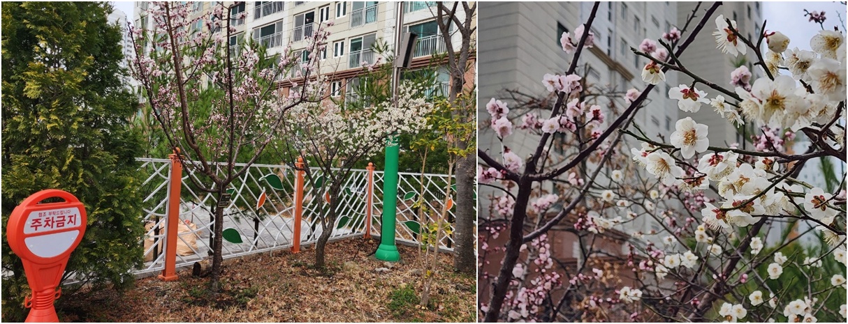 매화는 잎보다 먼저 꽃이 핍니다. 매화는 정말 부지런합니다. 추위가 채 가시기도 전에 아직 나무가 앙상한데도 잎보다 꽃이 먼저 핍니다. 추운 겨울 끝에서 피어나는 꽃이라 예부터 “봄을 여는 꽃”이라 불렸습니다. 매화 향기는 은은합니다. 가까이 가야 느낄 수 있는 향기, 봄 냄새입니다. 우리 학교 주차장 깊숙이 들어가면 붉은 매화와 흰 매화가 나란히 피어 있습니다.