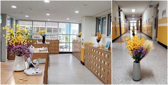 봄이 오면 가장 먼저 눈에 띄는 꽃이 바로 개나리입니다. 학교 울타리나 아파트 꽃밭에서도 쉽게 만날 수 있습니다. 우리 학교를 상징하는 학교 꽃(교화)이기도 합니다. 개나리를 자세히 보면 꽃잎이 넉 장입니다. 노란 별처럼 보여요. 바람이 불면 노란 종처럼 흔들려요. 교장실 앞 골마루에도 조화로 꽃병에 개나리도 함께 담아 두었습니다. 노랗게 따뜻한 3월이 될 것입니다.