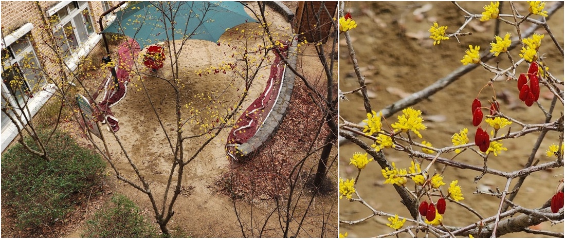 우리 학교에서도 유치원 쪽 모래 놀이터 쪽에 2층에서 1층으로 내려다보면 산수유가 지난해 열매와 지금 노란 꽃이 함께 핀 모습을 볼 수 있어요. 신기하기도 하고 마음이 따뜻해져요.