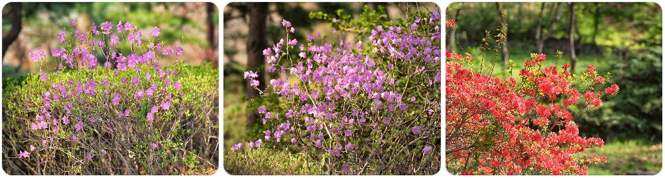 철쭉은 3월에는 꽃보다 꽃눈을 먼저 볼 수 있습니다. 꽃눈은 마치 작은 붓처럼 가지 끝에 모여 있습니다. 진달래랑 비슷해 보이지만, 철쭉은 연분홍 꽃이 필 때도 잎도 같이 나오고, 꽃받침 부분이 끈적끈적합니다. 아직 꽃이 안 피었으면 가지 끝에 맺힌 통통한 ‘꽃눈’을 관찰하세요. 저 작은 꽃눈 속에 봄꽃이 숨어 있습니다. 진달래와 함께 산 꽃 잔치가 열리면 사람들이 많이 찾지요.