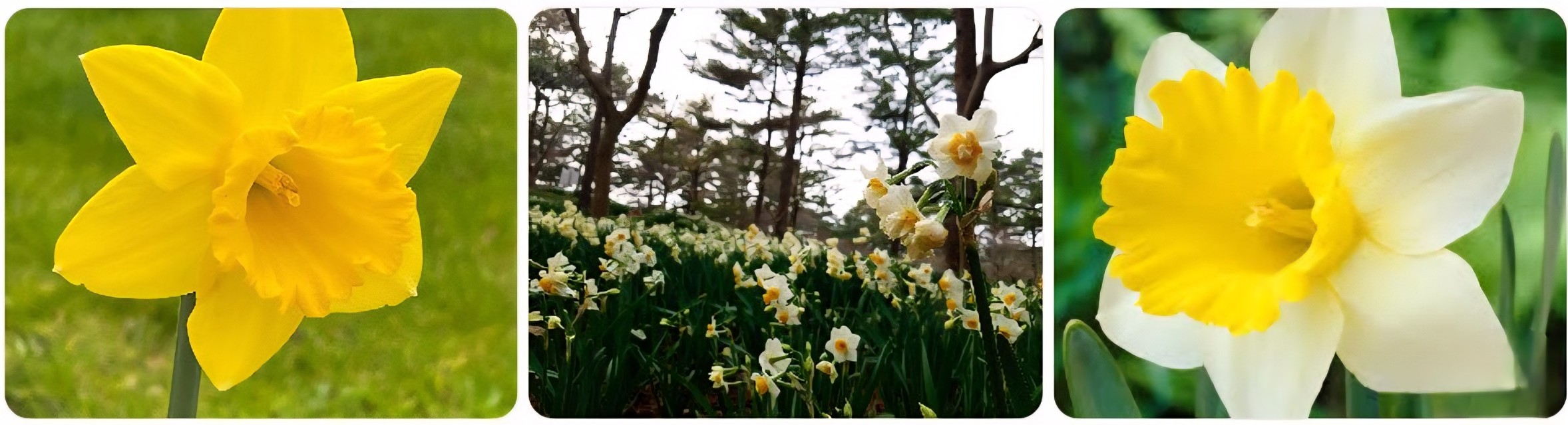 수선화는 나팔 모양 꽃이 특징입니다. 꽃밭(화단)에서 자주 볼 수 있는 꽃입니다. 꽃 가운데 노란 나팔이 봄 곡을 연주하는 것처럼 보입니다. 옛날 그리스 신화에 '나르키소스'라는 청년이 이 꽃이 되었다는 전설도 있답니다.