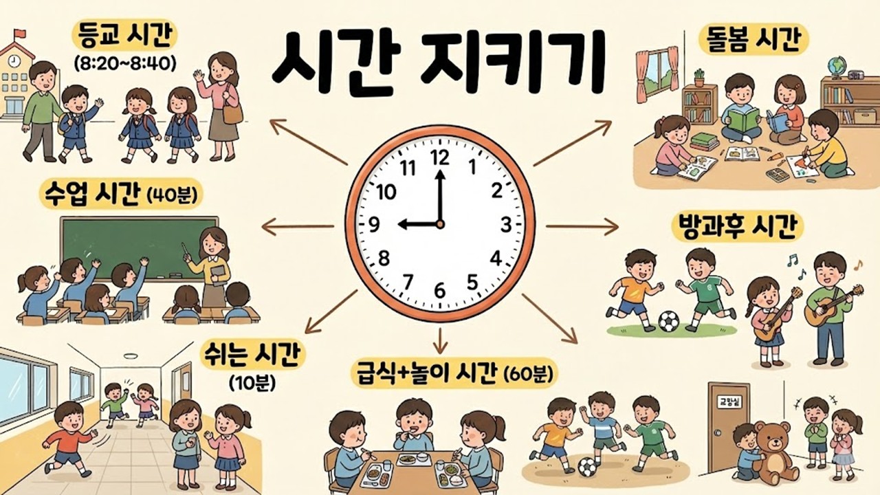 학부모님께 드리는 '기다림'의 한마디 ☕ 처음 학교에 온 1학년 아이들에게 '시간 지키기'는 어려울 수 있습니다. 집에서는 엄마, 아빠가 챙겨주었지만, 이제는 스스로 시계를 보고 움직여야 하니까요. 아이들이 조금 늦더라도 "빨리빨리!"라고 재촉하기보다는, "지금 시계 바늘이 어디에 있니? 그다음엔 무엇을 해야 할까?“ 라고 질문을 던져주세요. 아이가 스스로 시계와 대화하며 시간을 다스리는 힘을 기를 수 있도록 곁에서 조금만 더 여유 있게 기다려주시면 고맙겠습니다. 그 작은 기다림이 아이의 '책임감'이라는 단단한 뿌리가 될 것입니다.