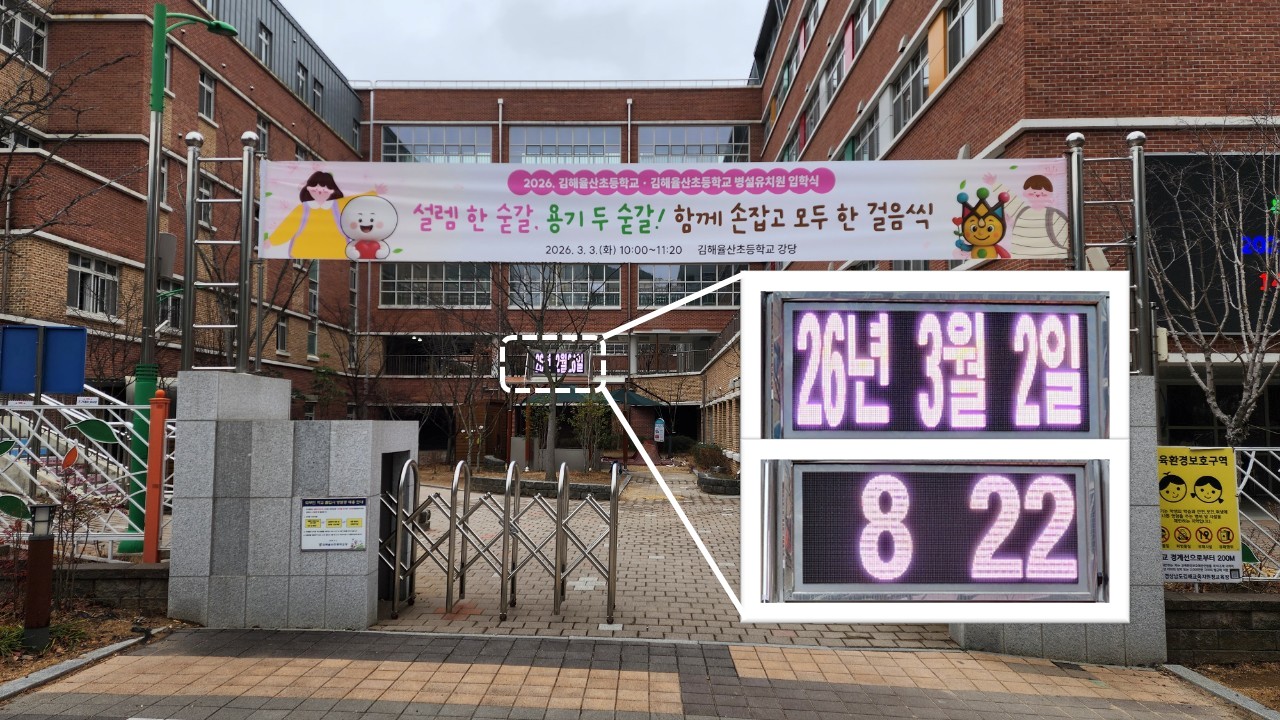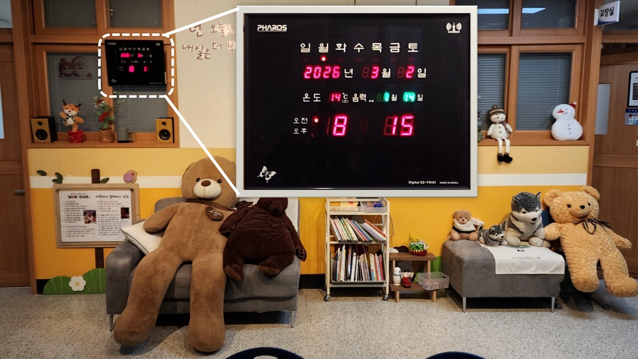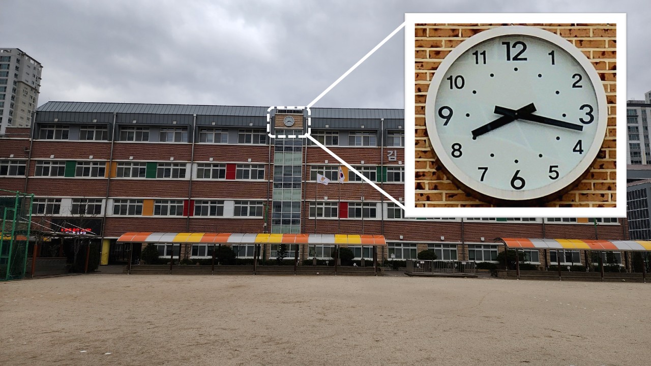 조용히 알려주는 똑똑한 시계, 교장실 앞에도 시계가 하나 있습니다. 이 시계는 조금 특별합니다. 시간뿐 아니라 날짜, 요일, 온도, 음력 날짜 까지 알려주는 전자 시계입니다. 그래서 지나가다가 보면 “오늘은 무슨 요일이지?” “오늘 날씨는 몇 도일까?” 이런 것도 함께 알 수 있습니다. 그래서 이 시계는 학교 생활 정보를 알려주는 시계라고 할 수 있습니다. 왜 학교에는 시계가 많을까요? 학교에는 많은 아이들이 함께 생활합니다. 한 반만이 아니라 천 명이 넘는 아이들이 함께 생활합니다. 그래서 시간을 함께 지키는 약속이 아주 중요합니다. 교육부에서도 학교 교육과정은 정해진 수업 시간과 생활 시간을 기준으로 운영하도록 규정하고 있습니다. 즉, 학교 생활은 시간 약속 위에서 이루어지는 공동생활입니다. 그래서 학교 곳곳에 여러 개 시계가 있습니다.
