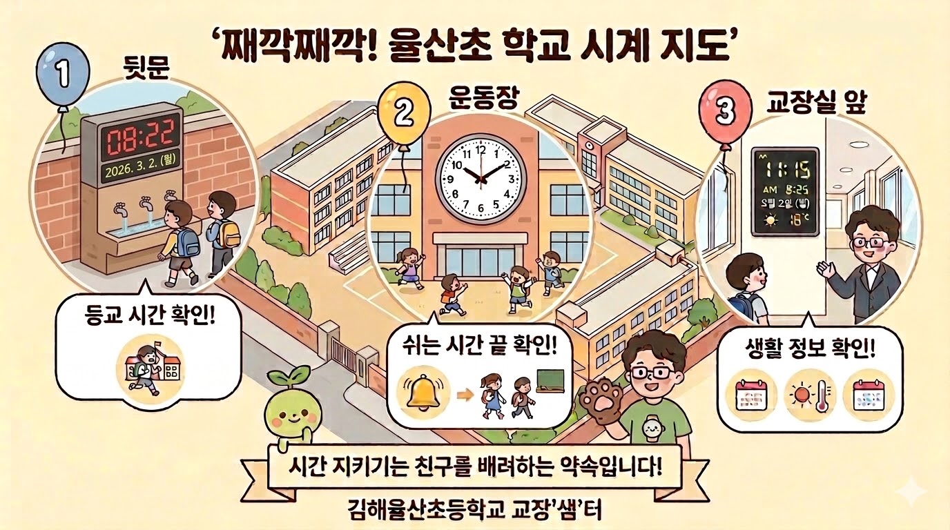 시간은 친구를 배려하는 약속 시간을 지킨다는 것은 단지 시계를 보는 일이 아닙니다. 시간을 지킨다는 것은 친구를 기다리게 하지 않는 것 선생님과 약속을 지키는 것 함께 생활하는 사람을 배려하는 것입니다. 그래서 학교에서는 시간 지키기가 가장 중요한 규칙 가운데 하나입니다. 뒤문 시계 → 등교 시간 확인 운동장 시계 → 쉬는 시간 끝 확인 교장실 앞 시계 → 날짜·요일·온도 확인 이 세 시계가 여러분의 학교 생활을 조용히 도와주고 있습니다.