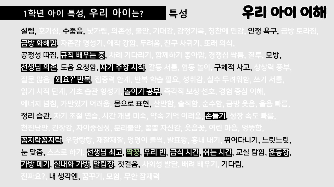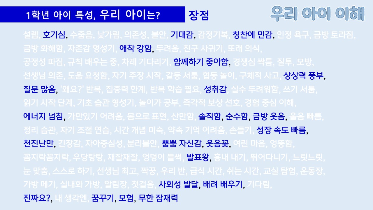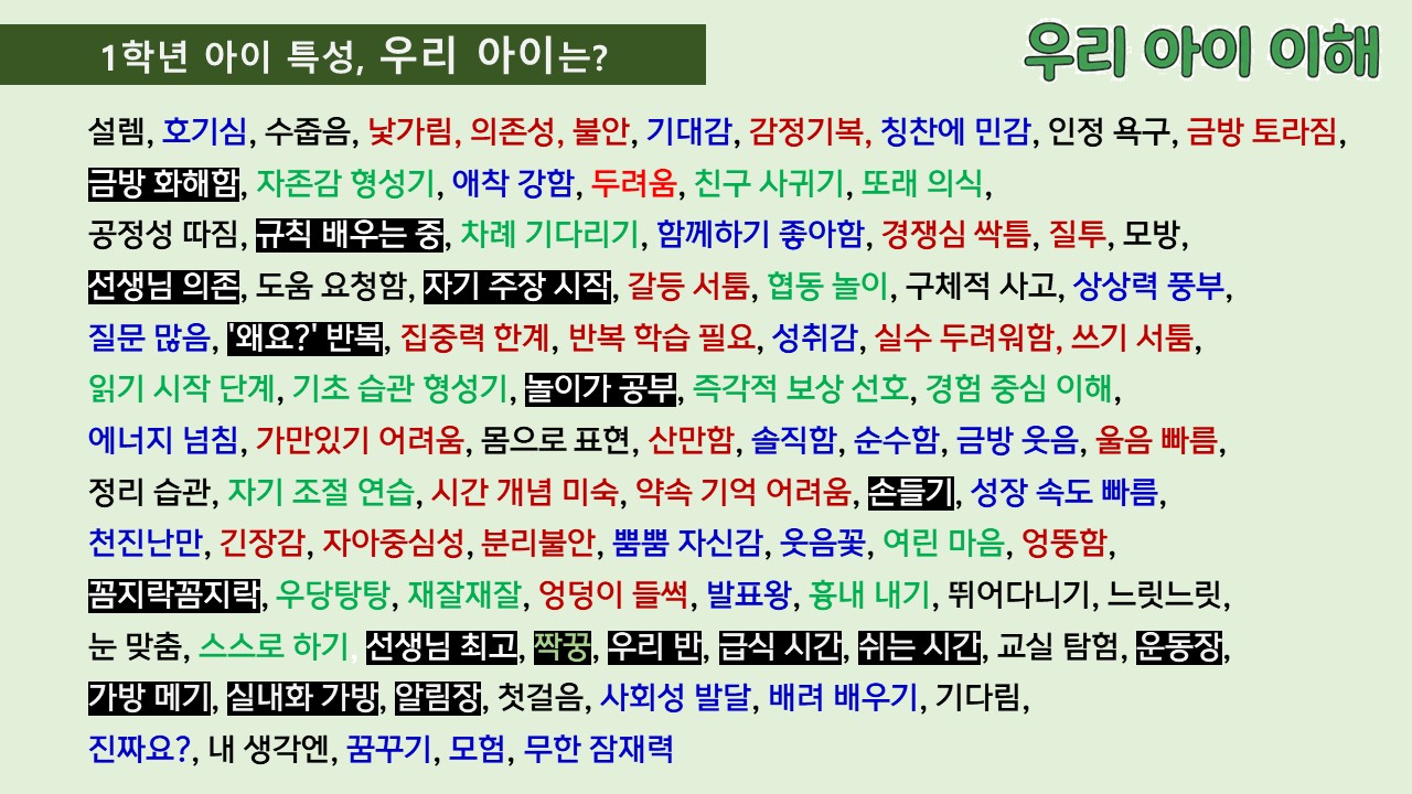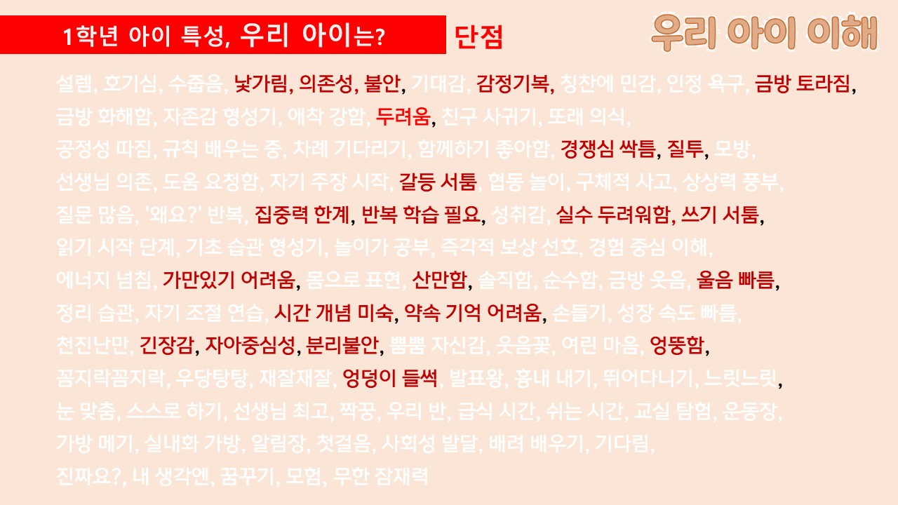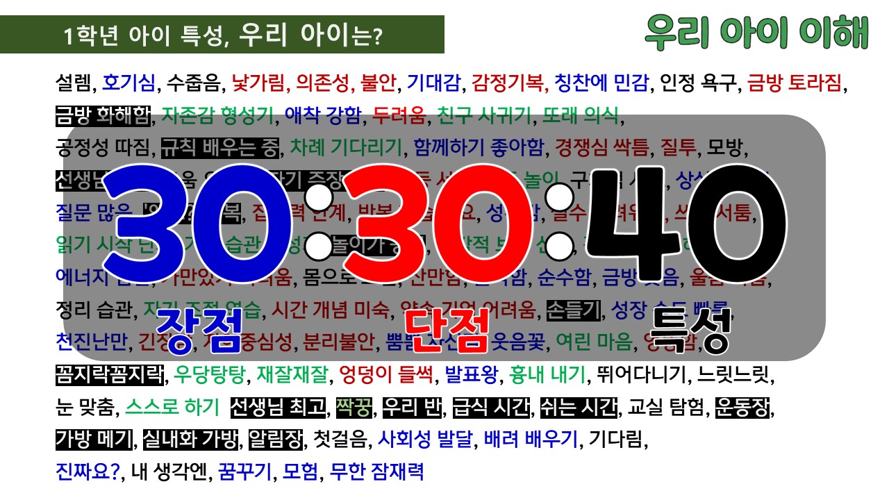 1. 1학년 아이를 이해하는 세 가지 눈 제가 이야기한 30 : 30 : 40의 뜻은 이것입니다. 30% 장점, 30% 단점, 40% 특성 우리 아이들을 볼 때 이 세 가지 눈으로 바라보자는 이야기입니다. 그런데 중요한 점이 하나 있습니다. 아이 행동은 하나로 딱 정해지지 않습니다. 어떤 때는 장점이 되고 어떤 때는 단점이 되고 어떤 때는 그냥 아이의 성장 과정에서 나타나는 특성이 됩니다.
