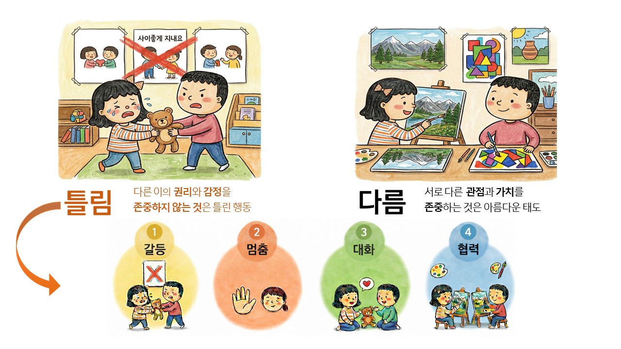 3. 1학년 아이들의 중요한 배움 이 시기 아이들이 배우는 아주 중요한 것이 있습니다. 바로 “틀림”과 “다름”을 구분하는 것입니다. 아이들은 자주 이렇게 말합니다. “내가 맞아!”, “너 틀렸어!”, 왜 그럴까요? 아이들은 아직 세상을 흑백으로 판단하는 시기이기 때문입니다. 그래서 생각이 다르면, 방법이 다르면, 의견이 다르면 쉽게 “틀렸다”고 말합니다. 하지만 사실은 대부분 틀린 것이 아니라 다른 것입니다.