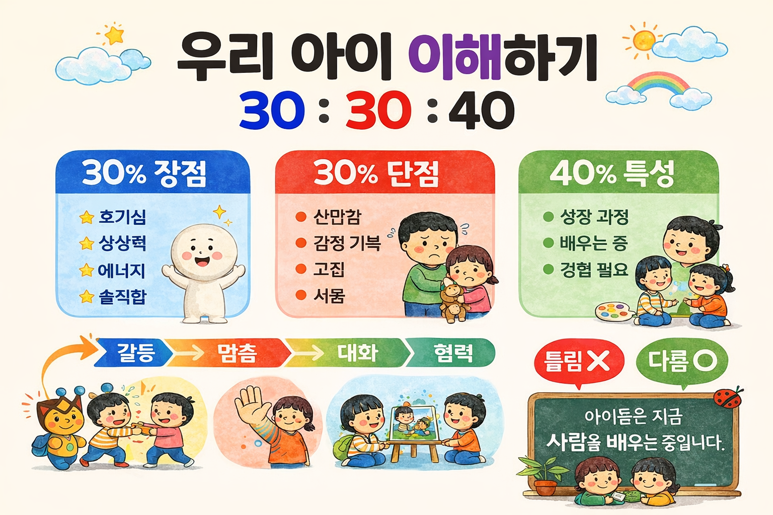 입학식 날이었습니다. 강당에 모인 학부모님들께 제가 이렇게 질문을 드렸습니다. “여러분, 30 : 30 : 40 이 숫자의 의미가 무엇일까요?” 수학 문제 같기도 하고, 비밀 암호 같기도 했지요. 하지만 이 숫자는 우리 1학년 아이들을 이해하는 중요한 힌트입니다.
