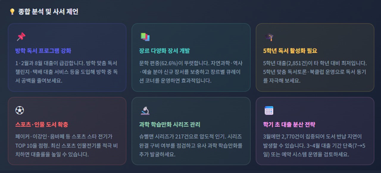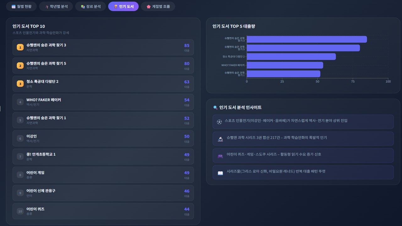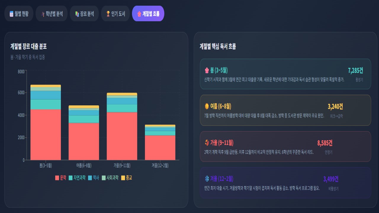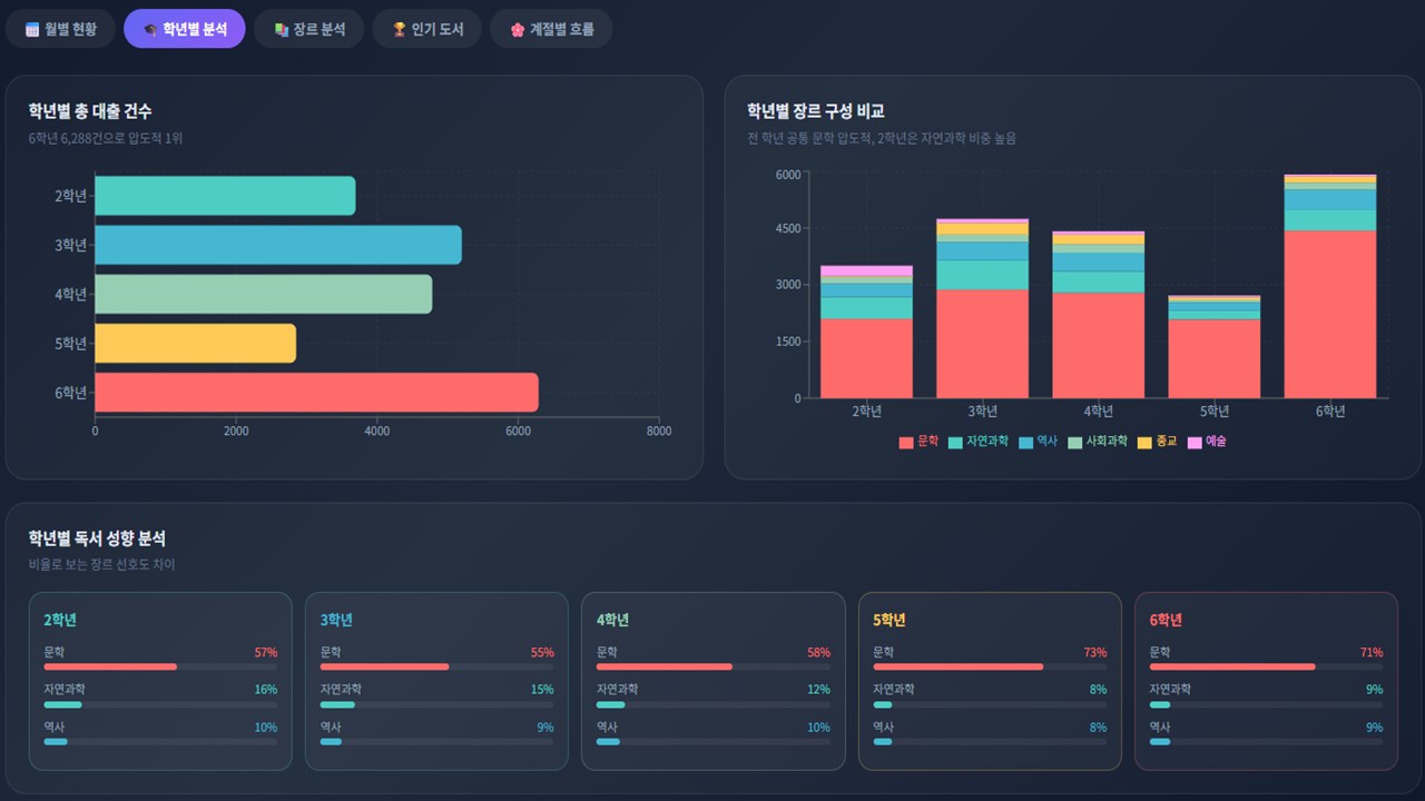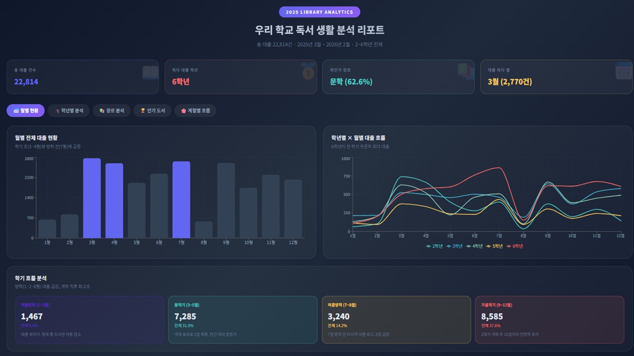 6학년이 2학년보다 약 1.7배 많은 책을 빌렸습니다. 특히 6학년은 여름(7월)과 가을(9~11월)에도 월 600건 이상을 꾸준히 유지하며 모든 학기 독서 선두 자리를 지켰습니다. 반면 5학년은 독서 절벽 구간이라 부를 만합니다. 학습 부담이 늘어나는 고학년 초입에서 독서와 멀어지는 경향이 데이터에서 선명하게 드러납니다. 이 시기야말로 교사와 학부모의 적극적인 독서 지원이 필요합니다. ️ 5학년 학부모님께 특별 제안 5학년은 독서량이 갑자기 줄어드는 '위험 학년'입니다. 이 시기 억지로 읽히는 것보다, 아이가 흥미를 느끼는 분야(스포츠, 과학, 유머 등)의 책부터 자유롭게 선택하게 하는 것이 효과적입니다. '독서 시간'을 정하기보다 '책이 자연스럽게 있는 환경'을 만들어 주세요.