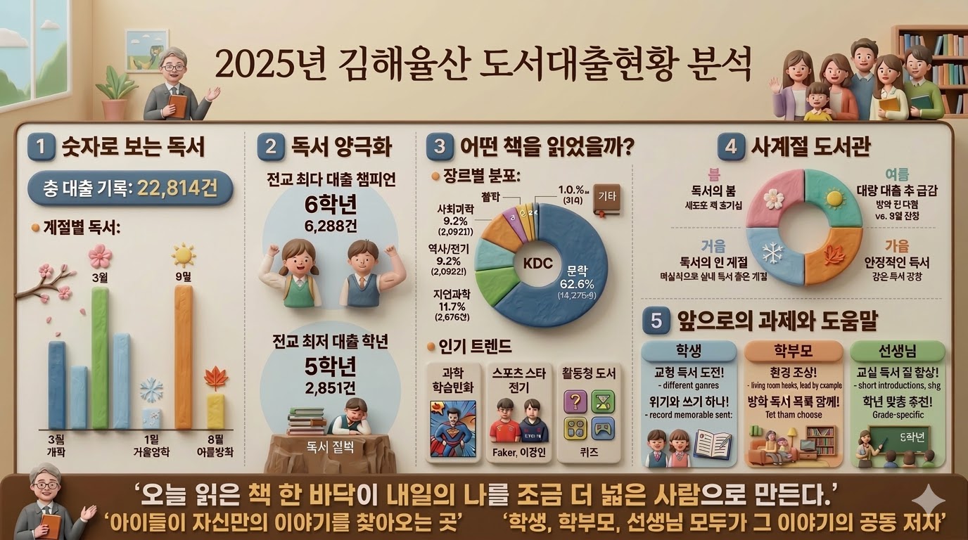 ◆ 독서를 평가로 연결하지 마세요 독서 감상문, 독후 활동지 등 의무적 독서 과제가 오히려 독서에 대한 거부감을 키울 수 있습니다. 자발적 독서 경험을 늘리는 방향, 즉 읽고 싶은 책을 자유롭게 고르고 읽는 즐거움을 느끼게 하는 것이 장기적으로 훨씬 효과적입니다. 6. 마무리: 22,814번 선택이 모여 만드는 것 22,814건 이 숫자는 우리 아이들이 1년 동안 도서관 문을 열고, 책장 사이를 걷고, 자신만의 책을 골라 든 행위의 총합입니다. 완벽한 독서가 아니어도 됩니다. 모드 장르를 균형 있게 읽지 않아도 됩니다. 중요한 것은 그 습관이 끊기지 않는 것입니다. 방학 중 한 권, 자기 전 30분, 밥 먹고나서 짧은 독서 이 작은 반복이 쌓여 5년 뒤, 10년 뒤 아이들 사고력과 감수성, 그리고 인생의 깊이를 결정합니다.