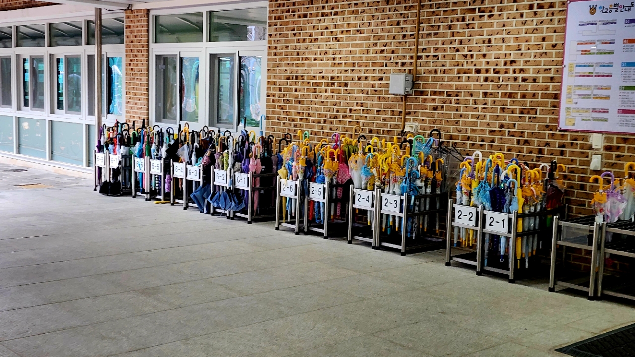 툭툭, 물방울을 털고 쏙— 우산을 꽂고 아이들은 가볍게 교실로 올라갑니다.
