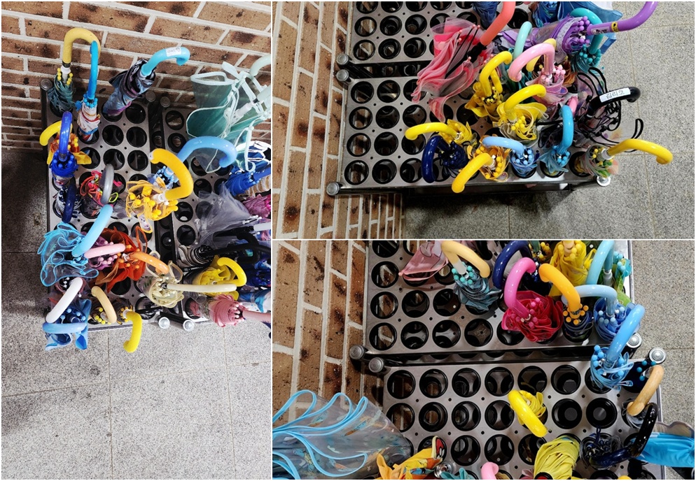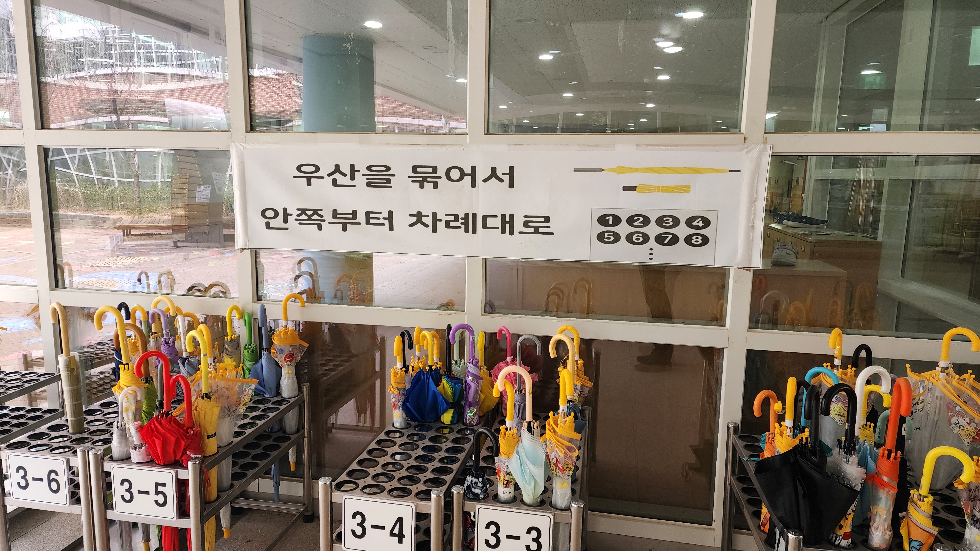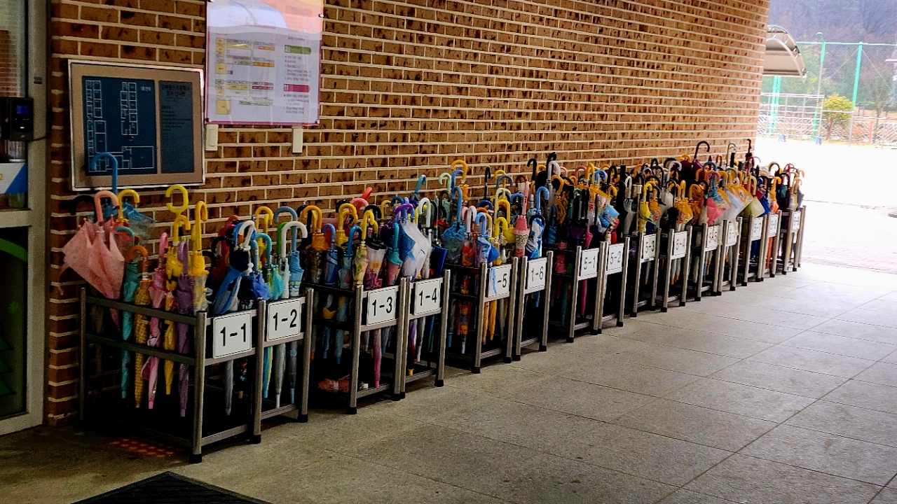 처음에는 우산 꽂이를 학년별로 쭉 붙여 두었습니다.