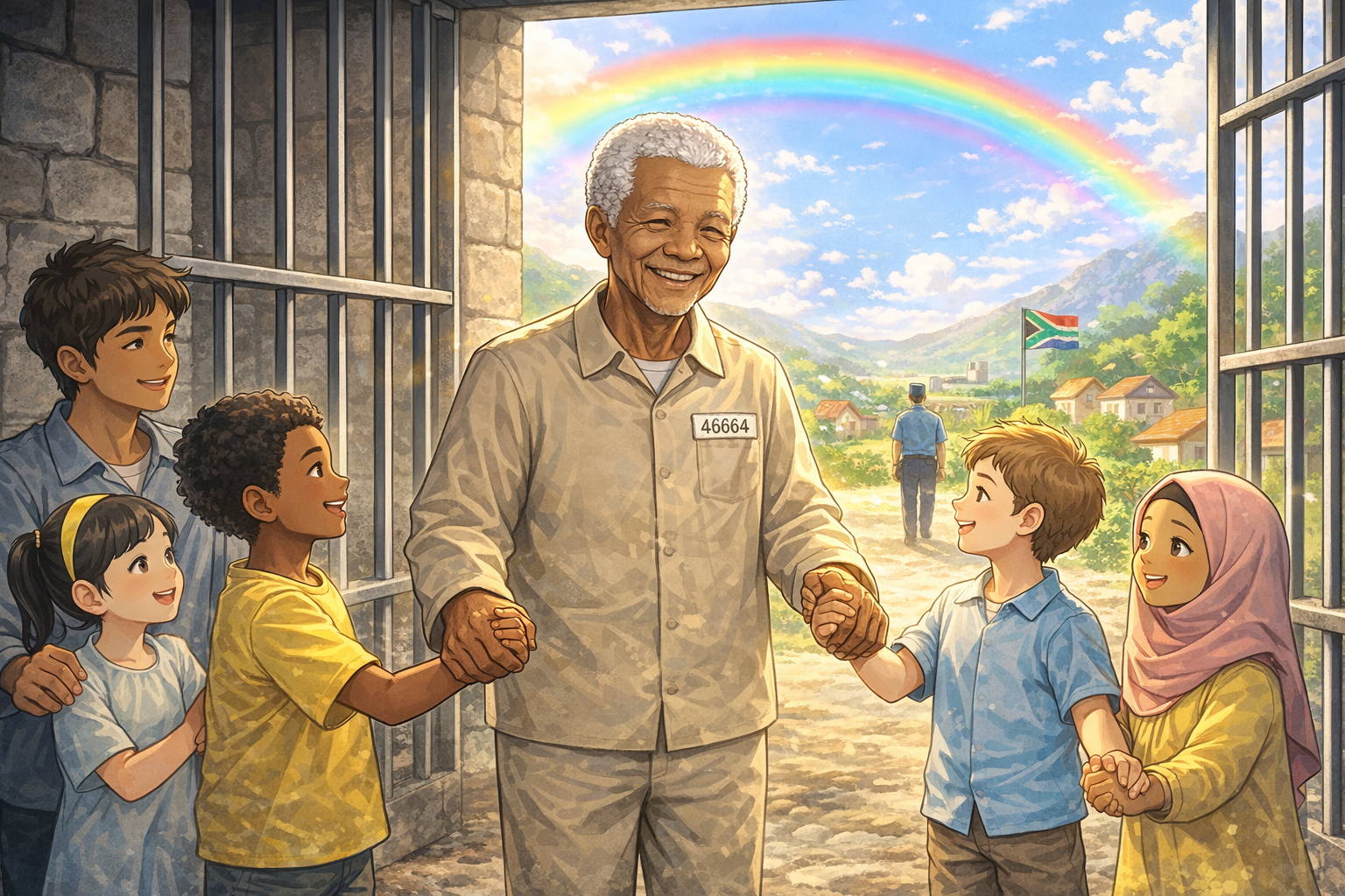 그분은 검은 피부가 더럽거나 열등한 것이 아니라 그저 하나의 다른 색깔일 뿐이라는 걸 온 세상에 보여 주셨어요. 그리고 대통령이 된 뒤에는 자신을 가두었던 사람들까지 품으며 검정과 하양이 함께 어울리는 ‘무지개 나라’를 꿈꾸었답니다.