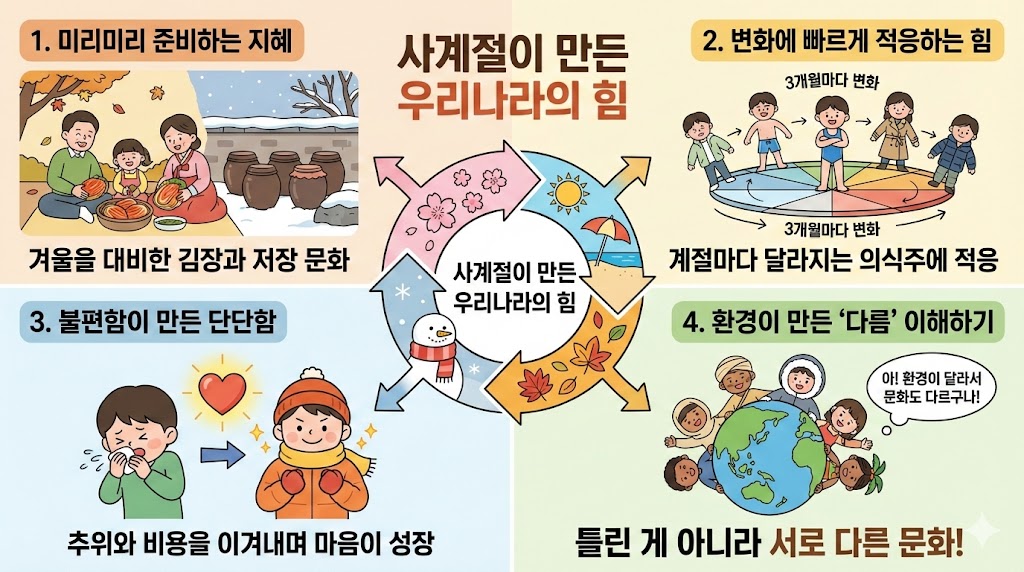 3. 계절은 ‘생각하는 방식’도 바꿔요 여기서 재미있는 점이 하나 있어요. 1년 내내 더운 나라에서는 “내일도 오늘처럼 따뜻하겠지!” → 오늘을 즐기는 마음이 자연스럽게 자랍니다. 계절이 바뀌는 나라에서는 “겨울이 오기 전에 준비해야 해.” → 미리 생각하고 계획하는 마음이 자라납니다. 날씨가 사람의 마음을 조금씩 빚어 가는 거예요.
