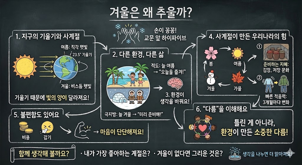 함께 생각해 볼까요? 내가 가장 좋아하는 계절은 언제인가요? 만약 우리나라에 겨울이 없다면, 우리가 가장 그리워할 것은 무엇일까요? 계절은 바람과 온도만 바꾸는 것이 아니라 사람의 삶과 생각, 그리고 문화를 함께 키웁니다.
