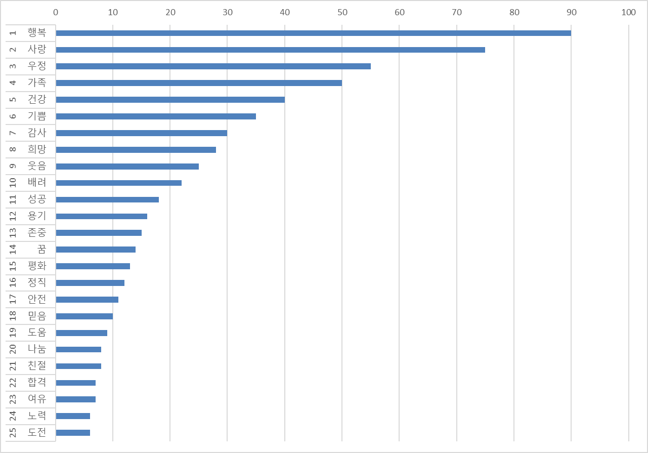 3. 낱말 하나하나를 보니, 가장 크게 불린 말이 있었습니다 이번에는 낱말 하나하나를 살펴보았습니다. 가장 많이 적힌 말은 바로 ‘행복’이었습니다. 그다음으로는 사랑, 우정, 가족, 건강, 기쁨 같은 말들이 이어졌습니다. 이 낱말들을 가만히 바라보다 보니 한 가지 공통점이 보였습니다.